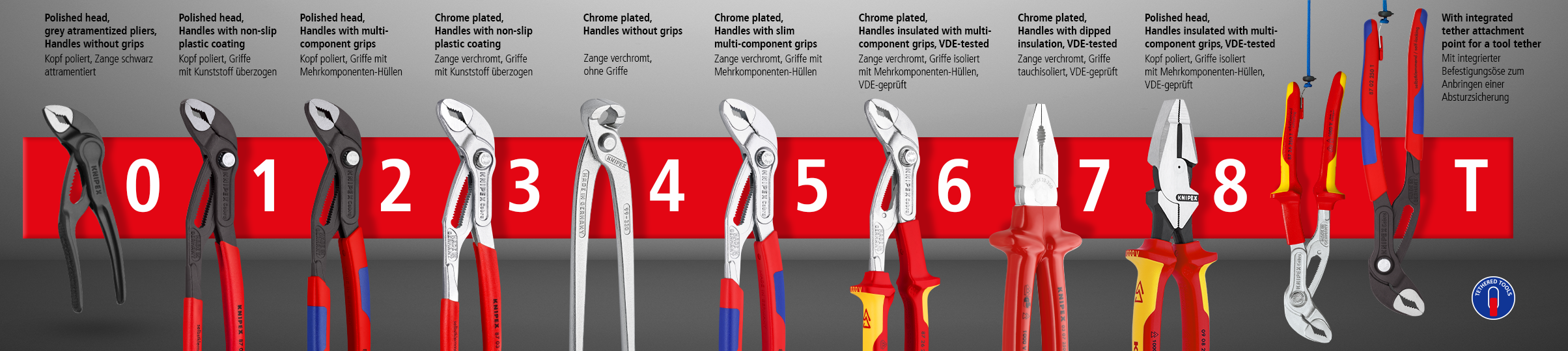 The fourth number of an item number directly contains several pieces of information about the pliers in your hands. It describes the finish, i.e. the head, the surface and the type of handles.